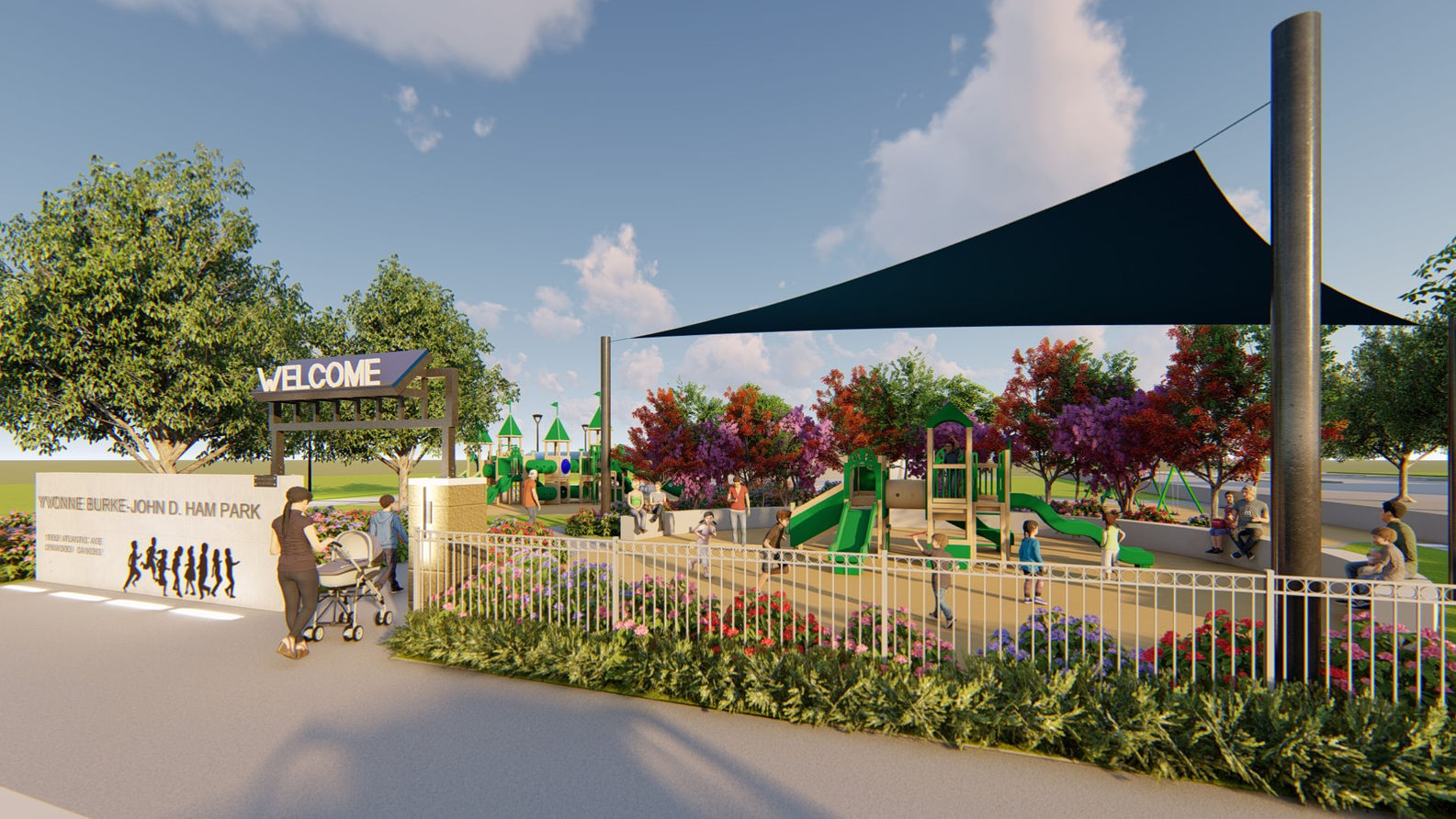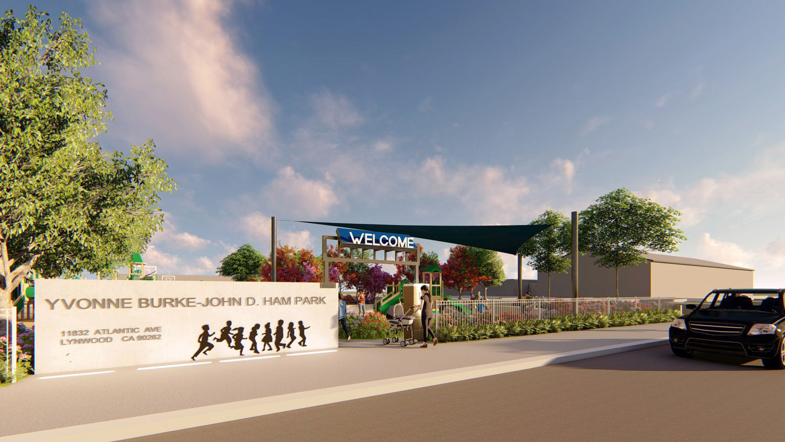 Description: Renovation of the existing Yvonne Burke - John D. Ham Park in the City of Lynwood. The project design included a new archway entry, two additional playground areas, new landscaping, additional electrical lighting as well as new wrought iron decorative safety fencing.