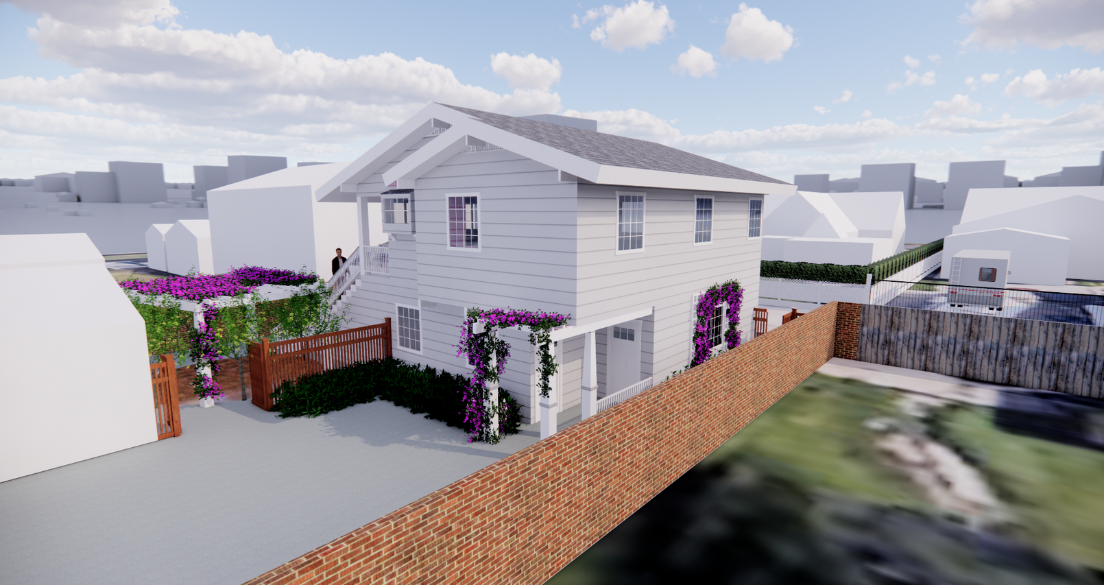Description: Design of a new Accessory Dwelling Unit (ADU) in the City of Whittier, CA. The project included two ground floor garages, two new laundry rooms, a backyard sitting area with overhead pergola, and an upper level two bedroom apartment.